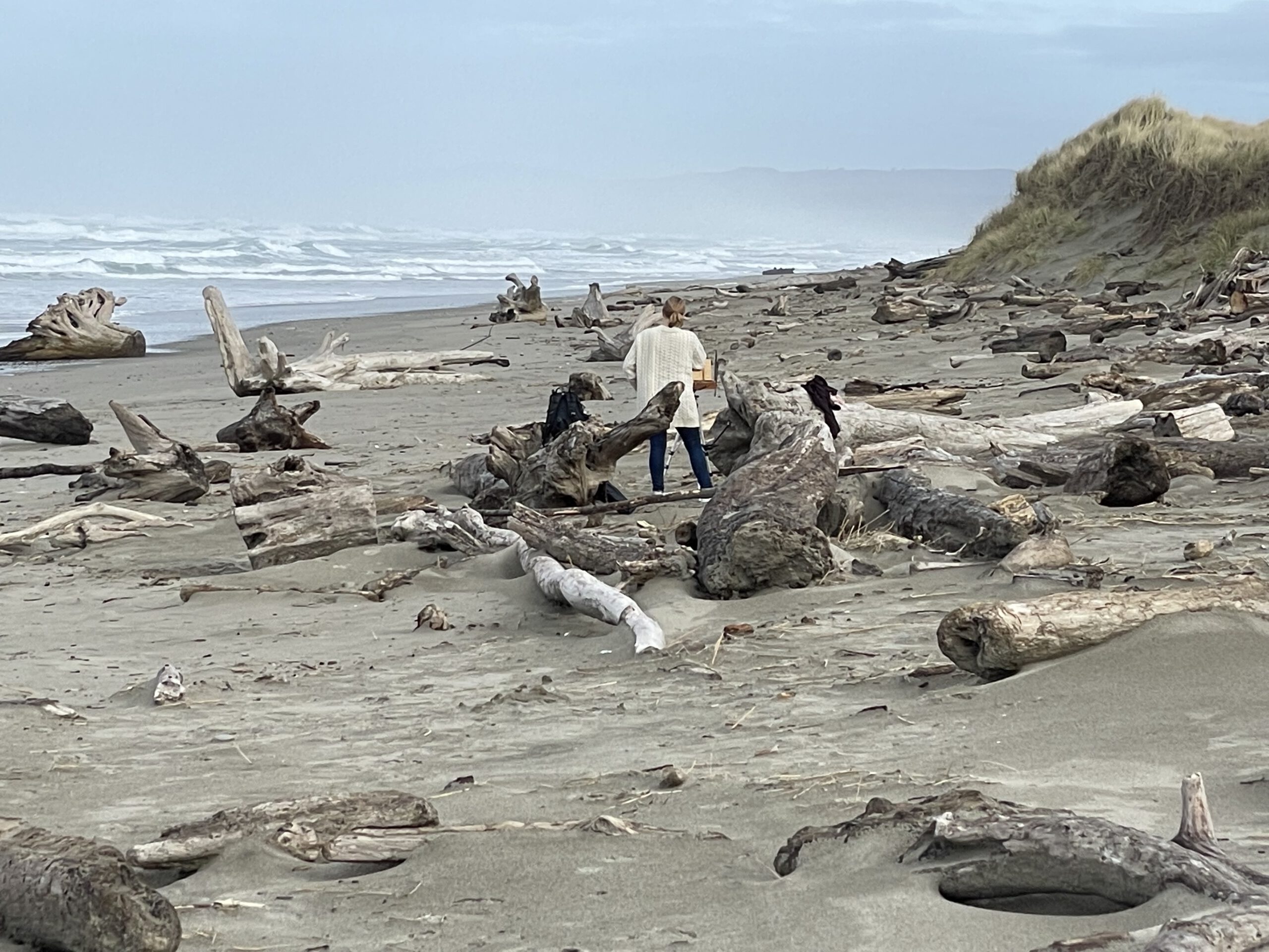Pointing Winnie south, Grandpa CrossCountry Bob (courtesy of Kenny and Steph) and Grandma Paintin’ Peggie (courtesy of Mariah and Troy), scooted down to the Oregon coast. Objective: get far enough south to be warm. Running interference on that objective were Ballard’s Beach State Park (great ocean painting country)…